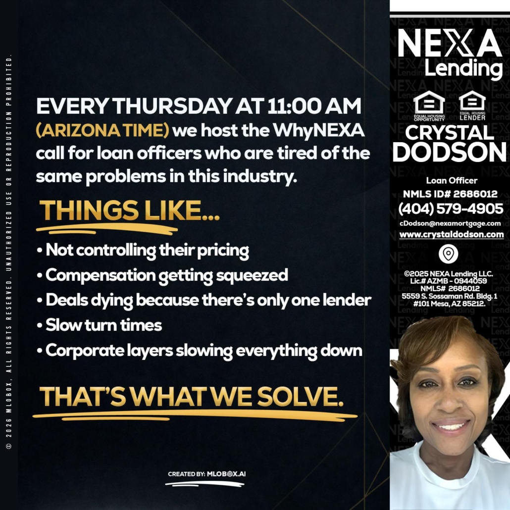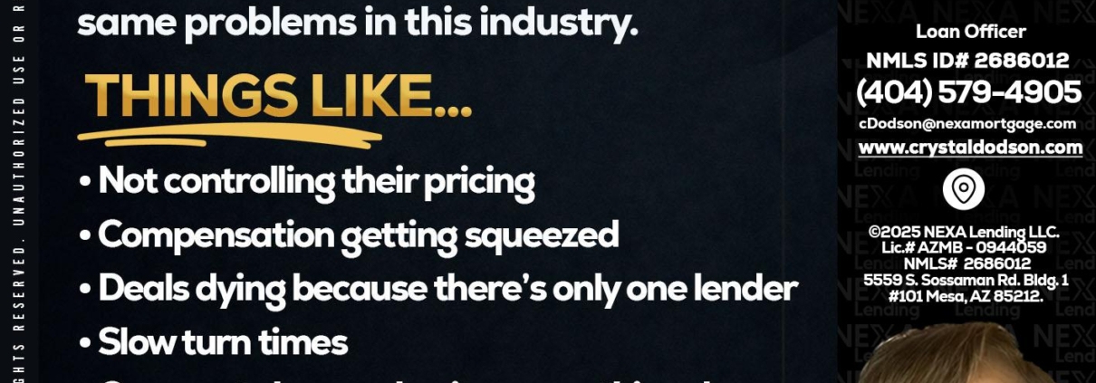 Hi, my name is Crystal Dodson. I’m a Loan Officer with NEXA Lending LLC., offering personalized mortgage solutions, fast customized quotes, great rates and service with integrity.