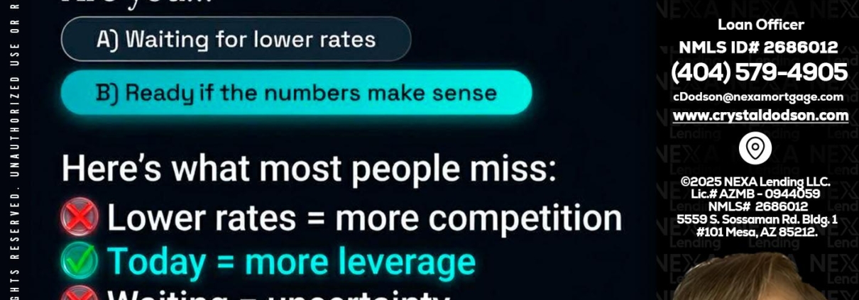 Hi, my name is Crystal Dodson. I’m a Loan Officer with NEXA Lending LLC., offering personalized mortgage solutions, fast customized quotes, great rates and service with integrity.
