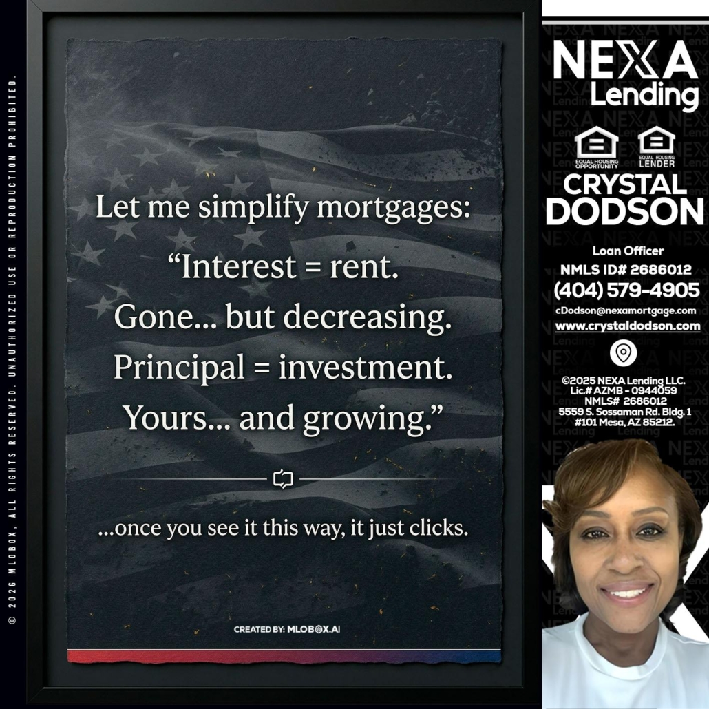 LET ME SIMPLIFY - Crystal Dodson -Loan OfficerHi, my name is Crystal Dodson. I’m a Loan Officer with NEXA Lending LLC., offering personalized mortgage solutions, fast customized quotes, great rates and service with integrity.