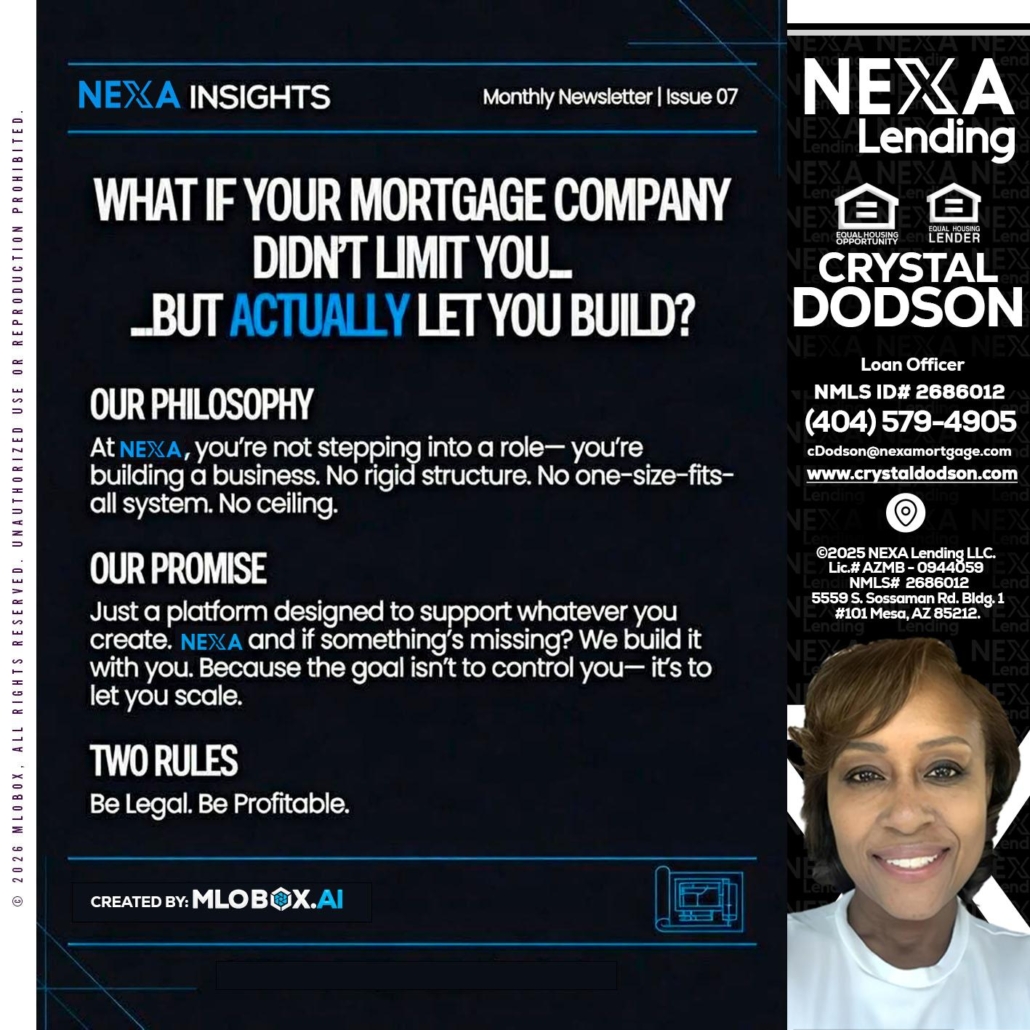 NEXA INSIGHTS - Crystal Dodson -Loan OfficerHi, my name is Crystal Dodson. I’m a Loan Officer with NEXA Lending LLC., offering personalized mortgage solutions, fast customized quotes, great rates and service with integrity.