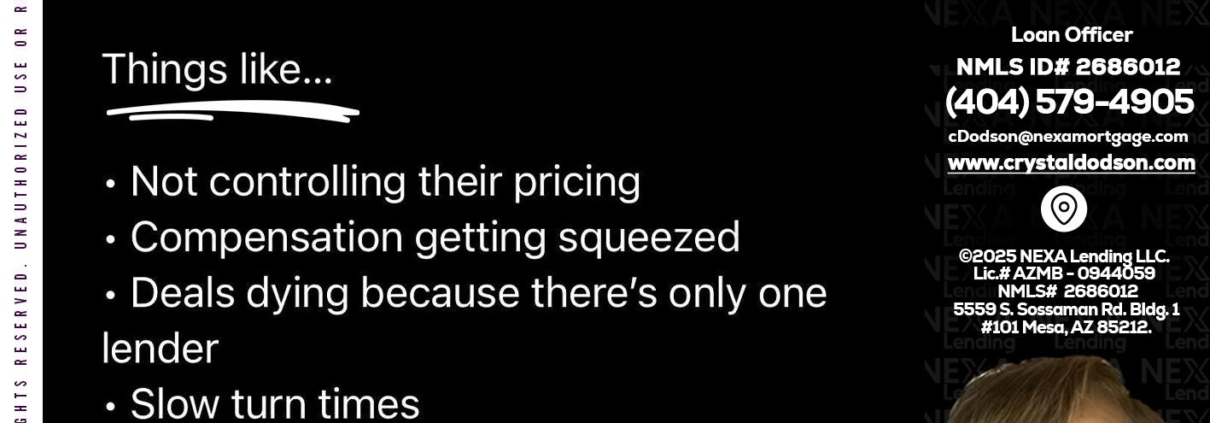Hi, my name is Crystal Dodson. I’m a Loan Officer with NEXA Mortgage LLC., offering personalized mortgage solutions, fast customized quotes, great rates and service with integrity.