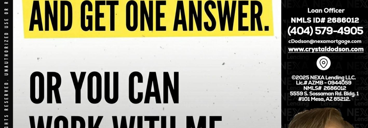 Hi, my name is Crystal Dodson. I’m a Loan Officer with NEXA Lending LLC., offering personalized mortgage solutions, fast customized quotes, great rates and service with integrity.